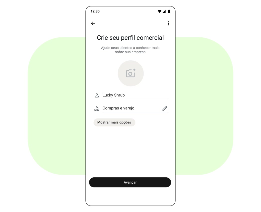 Para criar seu perfil do WhatsApp Business, basta preencher o nome e a categoria da sua empresa e carregar um logotipo ou uma imagem.