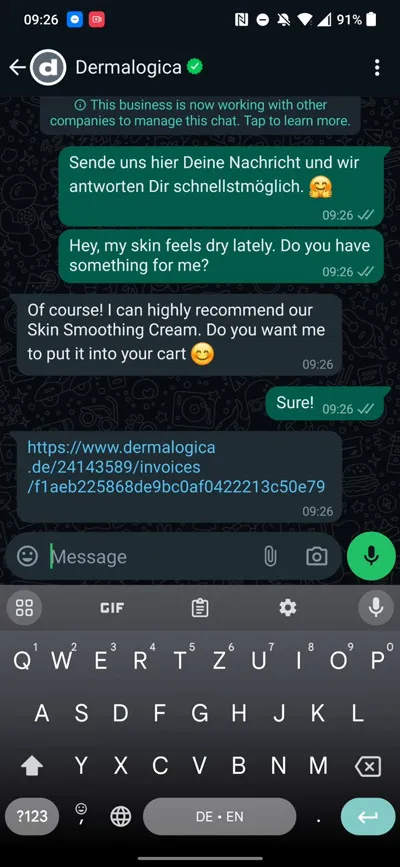 Dermalogica juga mengirimkan kampanye rutin kepada pelanggan yang sudah memilih untuk menerima pesan melalui WhatsApp, biasanya sebulan sekali. Orang-orang yang menjawab pesan ini akan menerima pesan langsung dari Manajer Komunitas.